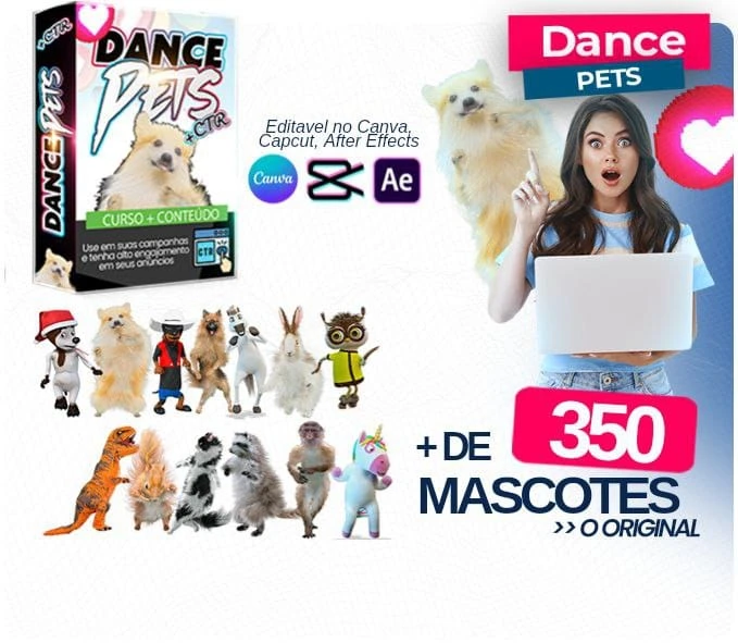 “Dance Pets Canva” do Mega Pack do Designer oferece acesso a um conjunto diversificado de artes para Canva, incluindo vídeos tutoriais para edição no Canva para celular e computador. Os destaques incluem 128 artes de mascotes, 15 artes de “Balofus”, 66 artes diversas e 50 artes de pessoas.